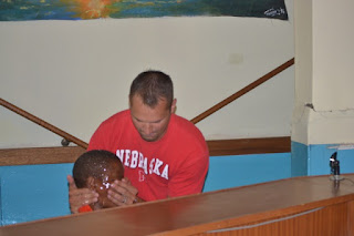 So, there I am on top of the ladder with a small African child sprinting toward us with something obviously important on his mind. As he arrives he shows us this massive toad that he found in the garden. For me, this was old news because I'd already seen him or his cousin. But for Chad and Petey this represented great new worlds opening before their very eyes. They proceed to examine, scrutinize and otherwise investigate this fresh life form presented to them...to the point where the toad kind of got a little ticked off.